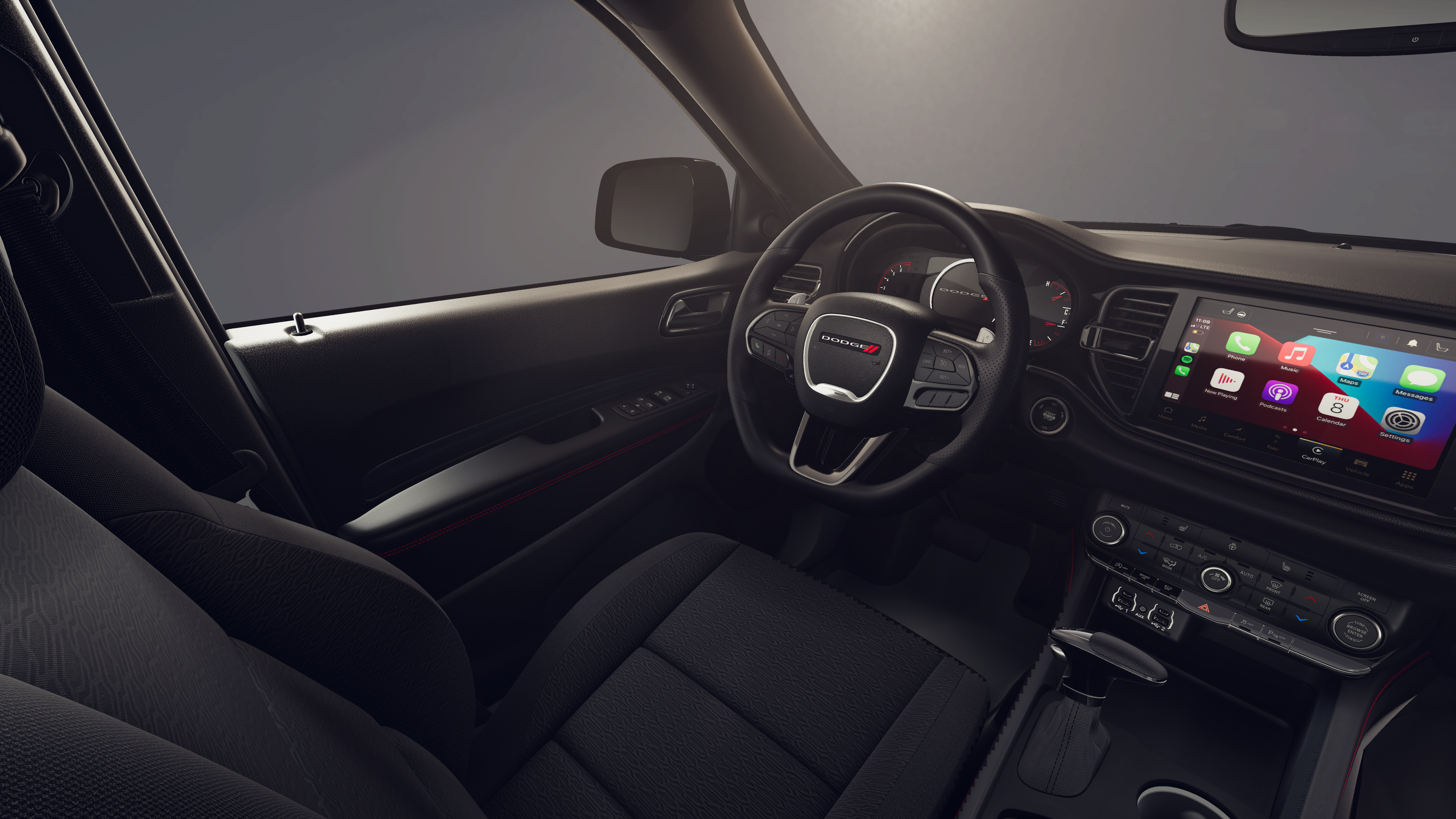 3.45 Rear Axle Ratio, 3rd row seats: split-bench, 4-Wheel Disc Brakes, 6 Speakers, ABS brakes, Air Conditioning, Alloy wheels, AM/FM radio: SiriusXM w/360L, Apple CarPlay/Android Auto, Auto-dimming Rear-View mirror, Automatic temperature control, Brake assist, Bumpers: body-color, Cloth Bucket Seats with Shift Insert, Compass, Delay-off headlights, Driver door bin, Driver vanity mirror, Dual front impact airbags, Dual front side impact airbags, Electronic Stability Control, Emergency communication system: Dodge Connect, Exterior Mirrors with Heating Element, Four wheel independent suspension, Front anti-roll bar, Front Bucket Seats, Front Center Armrest w/Storage, Front dual zone A/C, Front reading lights, Fully automatic headlights, Garage door transmitter, Gloss Black Exterior Mirrors, Heated door mirrors, Heated front seats, Heated steering wheel, Illuminated entry, Knee airbag, Leather steering wheel, Low tire pressure warning, Navigation System, Occupant sensing airbag, Outside temperature display, Overhead airbag, Overhead console, Panic alarm, ParkView Rear Back-Up Camera, Passenger door bin, Passenger vanity mirror, Power door mirrors, Power driver seat, Power Liftgate, Power steering, Power windows, Radio data system, Radio: Uconnect 5 Nav with 10.1 Display, Rear air conditioning, Rear anti-roll bar, Rear reading lights, Rear seat center armrest, Rear window defroster, Rear window wiper, Red Accent Stitching, Remote keyless entry, Speed control, Speed-sensing steering, Speed-Sensitive Wipers, Split folding rear seat, Spoiler, Sport steering wheel, Steering wheel mounted audio controls, Tachometer, Telescoping steering wheel, Tilt steering wheel, Traction control, Trip computer, Variably intermittent wipers, Voltmeter, and Wheels: 20 x 8 Fine Silver.