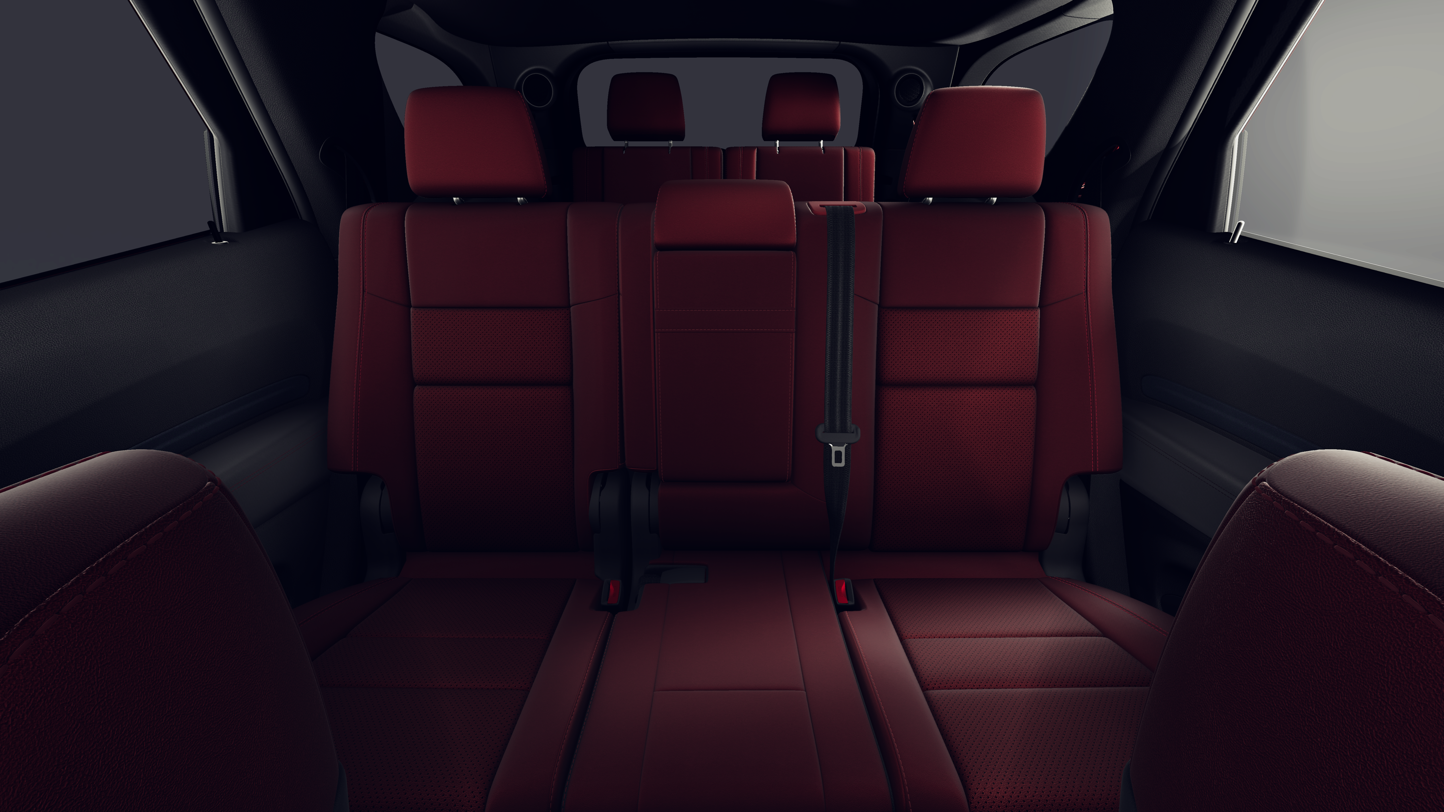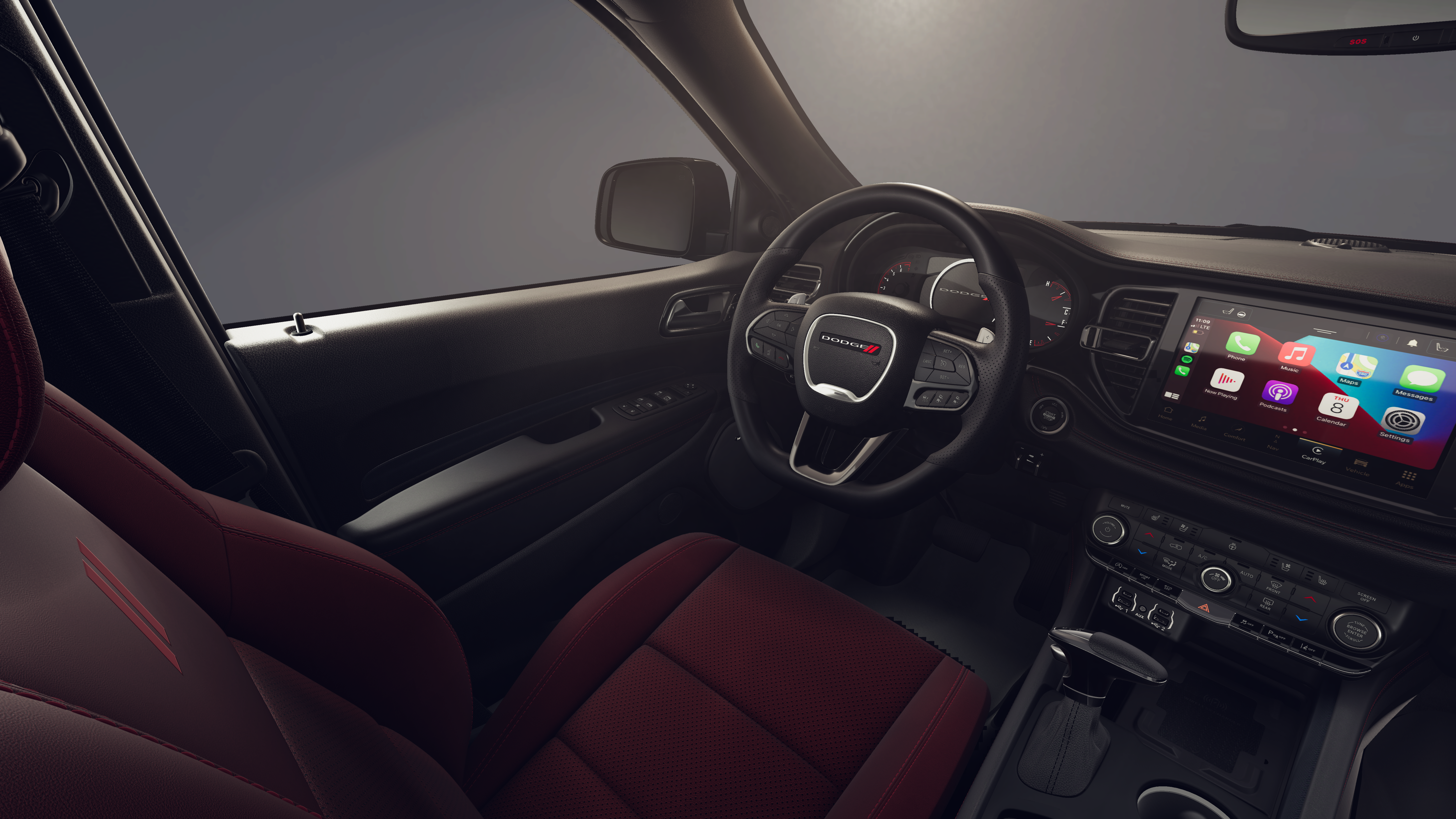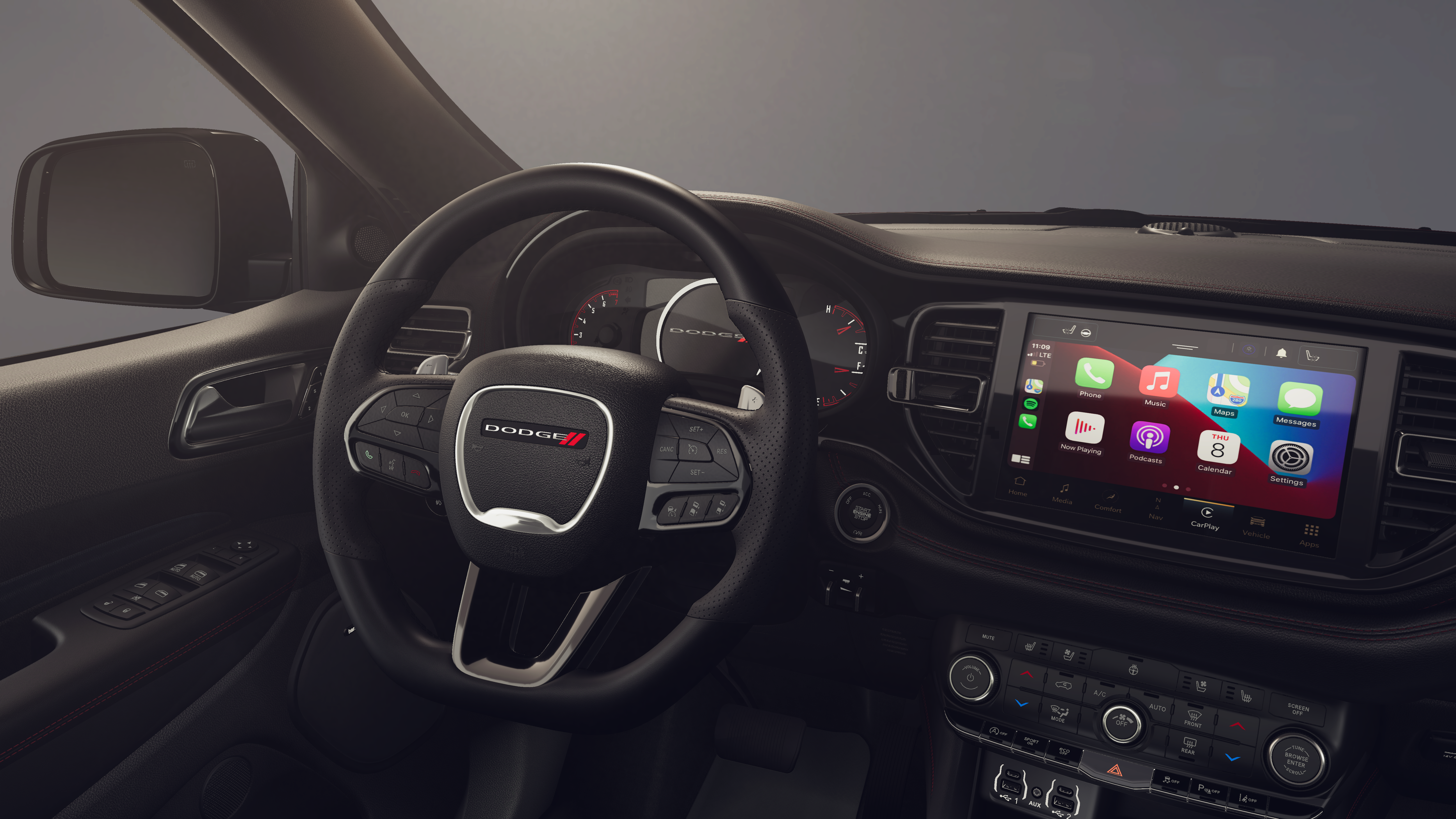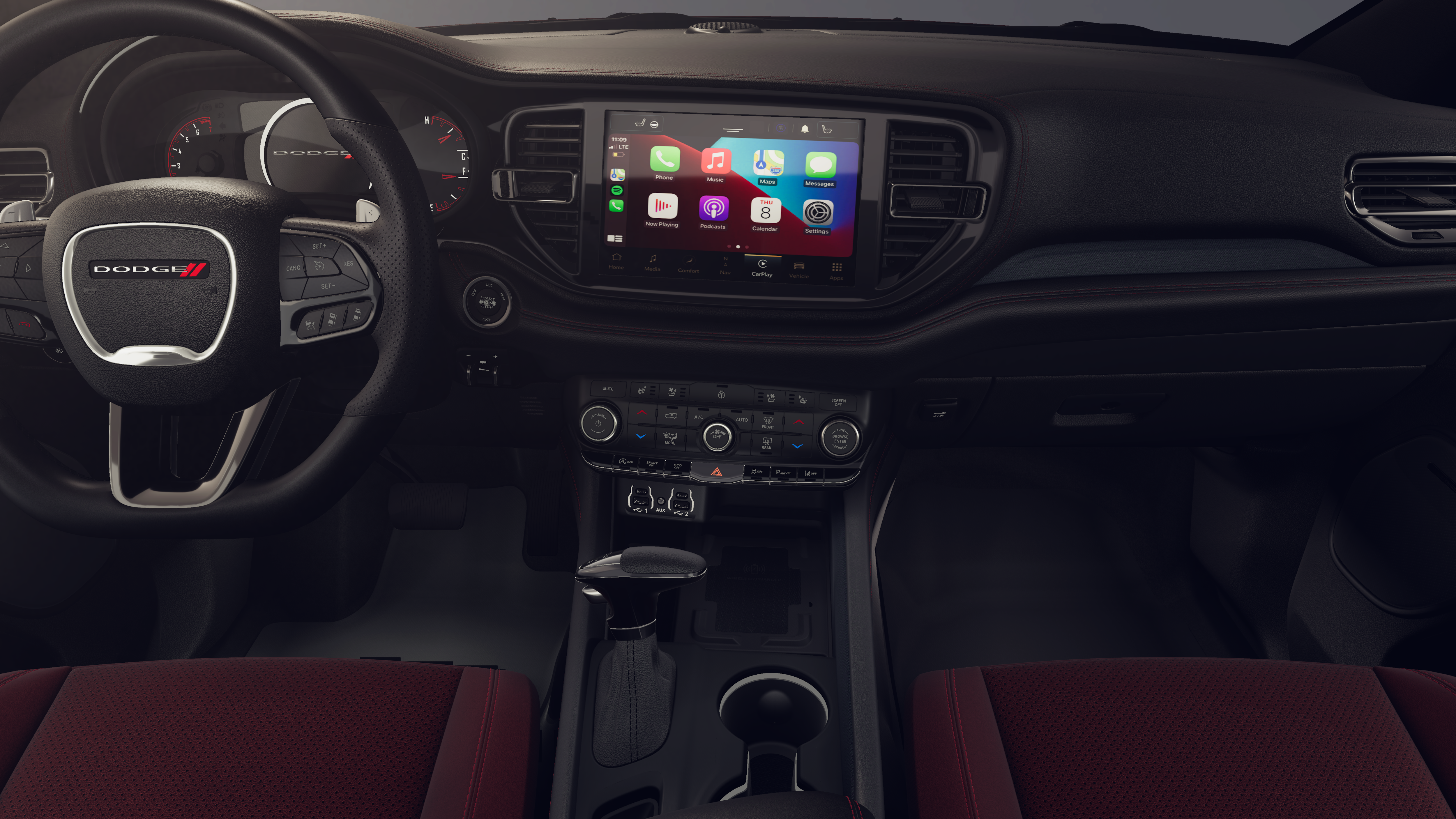 3.45 Rear Axle Ratio, 3rd row seats: split-bench, 4-Wheel Disc Brakes, 6 Speakers, ABS brakes, Air Conditioning, Alloy wheels, AM/FM radio: SiriusXM w/360L, Apple CarPlay/Android Auto, Auto-dimming Rear-View mirror, Automatic temperature control, Brake assist, Bumpers: body-color, Cloth Bucket Seats with Shift Insert, Compass, Delay-off headlights, Driver door bin, Driver vanity mirror, Dual front impact airbags, Dual front side impact airbags, Electronic Stability Control, Emergency communication system: Dodge Connect, Exterior Mirrors with Heating Element, Four wheel independent suspension, Front anti-roll bar, Front Bucket Seats, Front Center Armrest w/Storage, Front dual zone A/C, Front reading lights, Fully automatic headlights, Garage door transmitter, Gloss Black Exterior Mirrors, Heated door mirrors, Heated front seats, Heated steering wheel, Illuminated entry, Knee airbag, Leather steering wheel, Low tire pressure warning, Navigation System, Occupant sensing airbag, Outside temperature display, Overhead airbag, Overhead console, Panic alarm, ParkView Rear Back-Up Camera, Passenger door bin, Passenger vanity mirror, Power door mirrors, Power driver seat, Power Liftgate, Power steering, Power windows, Radio data system, Radio: Uconnect 5 Nav with 10.1 Display, Rear air conditioning, Rear anti-roll bar, Rear reading lights, Rear seat center armrest, Rear window defroster, Rear window wiper, Red Accent Stitching, Remote keyless entry, Speed control, Speed-sensing steering, Speed-Sensitive Wipers, Split folding rear seat, Spoiler, Sport steering wheel, Steering wheel mounted audio controls, Tachometer, Telescoping steering wheel, Tilt steering wheel, Traction control, Trip computer, Variably intermittent wipers, Voltmeter, and Wheels: 20 x 8 Fine Silver.